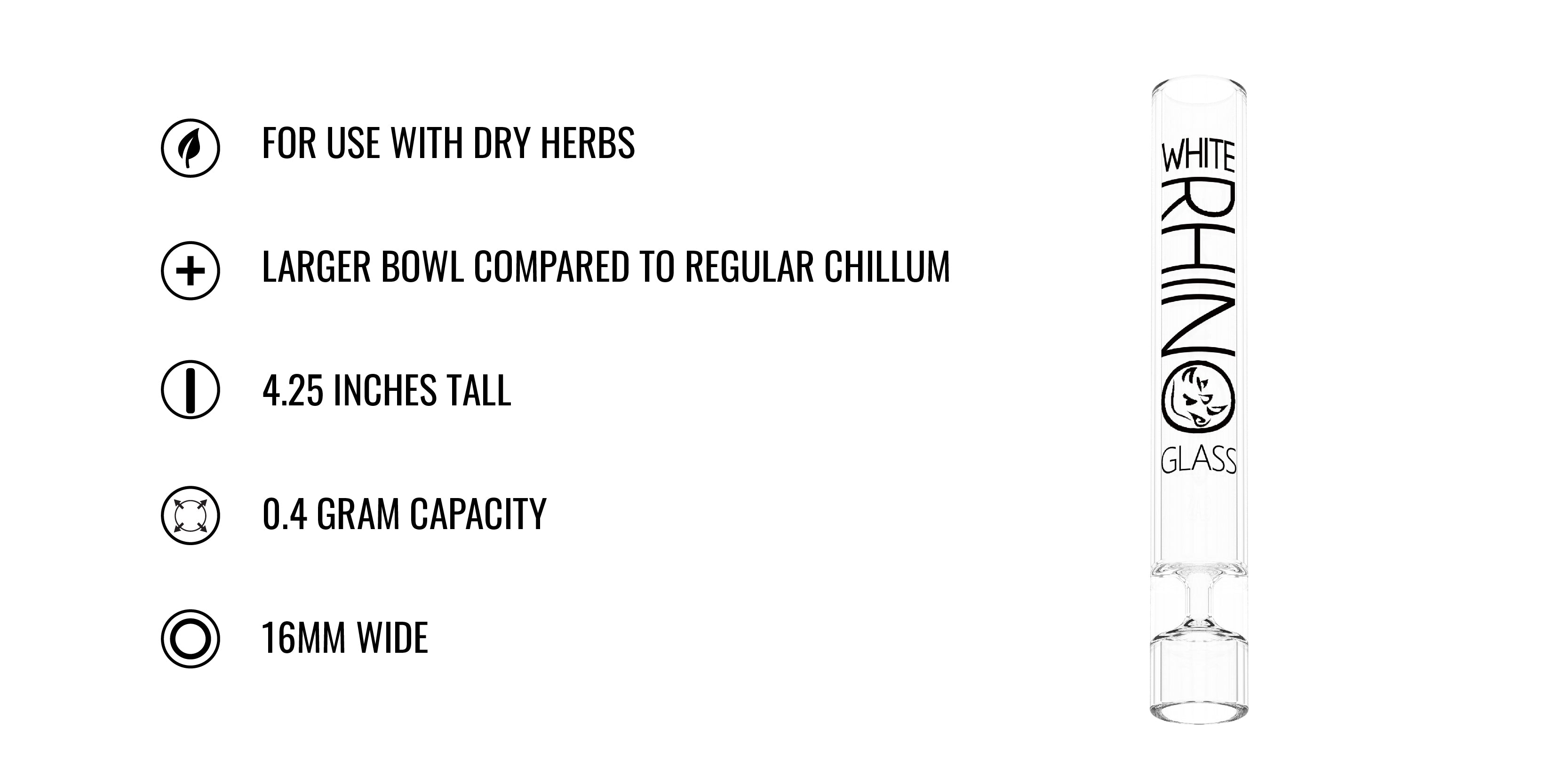 Overview: Introducing our bulk package of 25 extra-large glass chillum pipes, ideal for wholesalers looking to cater to discerning customers seeking a substantial and effective smoking solution. These chillums are significantly larger than the standard White Rhino clear glass model, designed to offer a more robust use and larger hits. Each chillum comes with a silicone cap, ensuring cleanliness and ease of use.