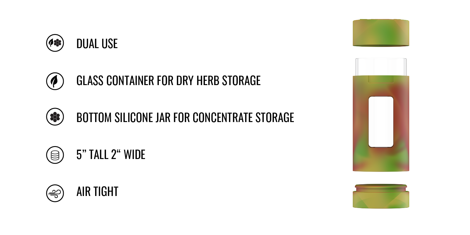 • Dual-Function Storage: Features a glass jar nestled within a sturdy silicone sleeve for safely storing dry herbs, and an integrated silicone jar at the base for concentrates, offering a comprehensive storage solution.