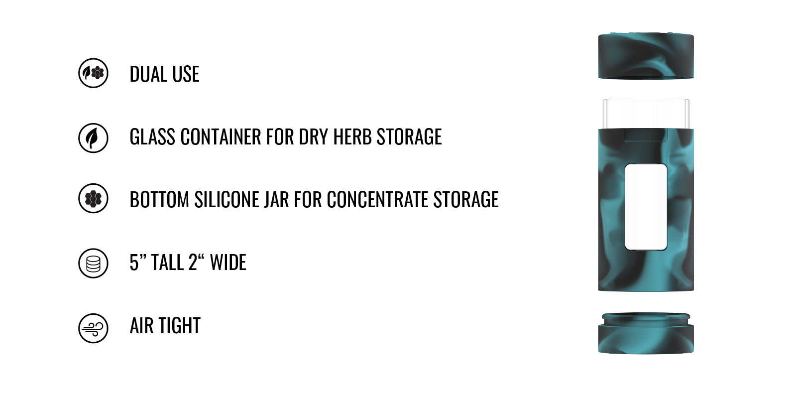 - Dual-Function Storage: The upper glass jar offers a pristine environment for dry herbs, while the lower silicone jar provides a secure space for concentrates, addressing the diverse storage needs of dispensary clients.