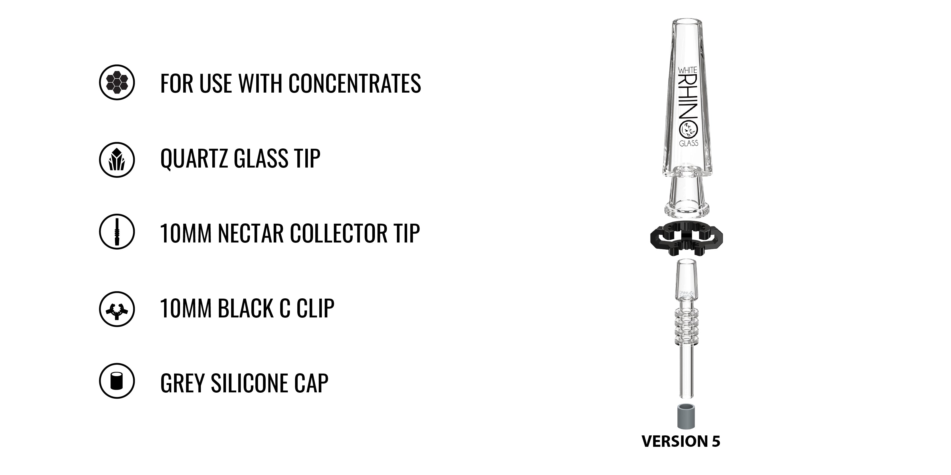 The White Rhino 2 Piece Nectar Collector V5 features a sleek updated design built for reliable concentrate use. This version feature a triangle shaped mouthpiece a while maintaining the simple two piece construction customers prefer.