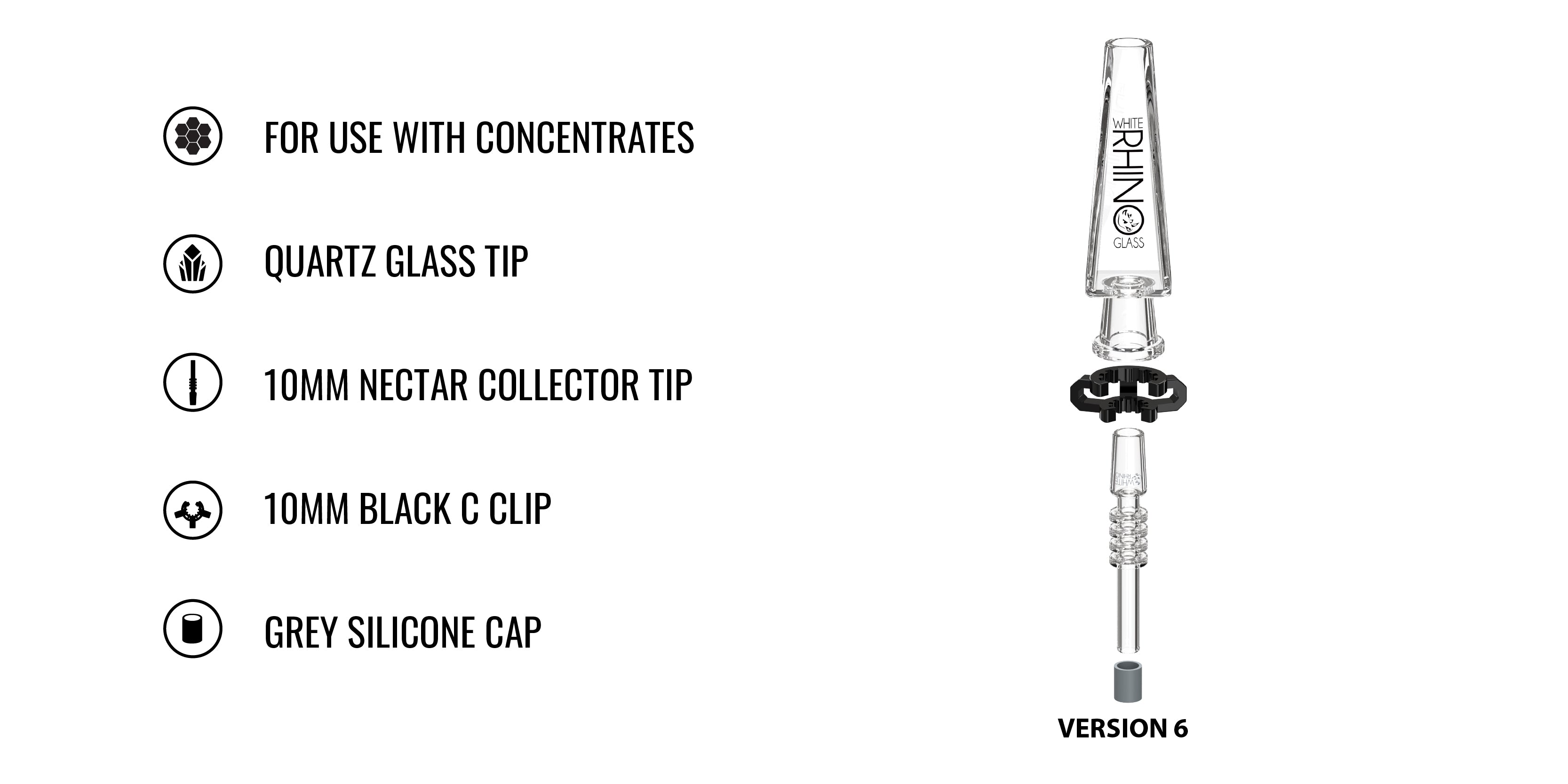 The White Rhino 2 Piece Nectar Collector V6 features a bold square geometric body design paired with a simple and reliable two piece construction for concentrate use. The angular mouthpiece gives this version a modern look while also providing a comfortable grip during use.
