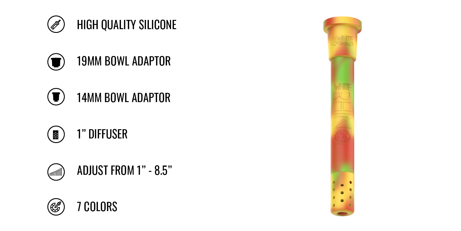 Introduce unparalleled versatility to your inventory with the White Rhino Adjustable Silicone Downstem. This innovative downstem is crafted to meet the dynamic needs of modern smokers, offering adjustable functionality that can extend from 1 inch up to 8.5 inches. Available in a vibrant array of 7 colors, this downstem is not only functional but also visually appealing, adding a splash of color to any waterpipe setup.